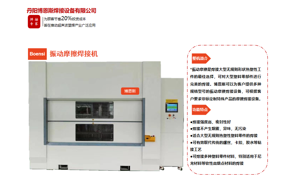 丹陽博恩斯焊接設備有限公司是塑料焊接領域集研發(fā)設計、生產制造、銷售服務為一體的企業。公司自成立以來堅持“以人為本”的理念,組織了一支強大的技術研發(fā)團隊,攜多年來積累的豐富經驗,并結合國際先進塑料焊接技術,根據市場需要,不斷開發(fā)具有核心競爭力的新產品。公司具有很強的非標機械研發(fā)、設計、生產能力,可為廣大客戶定制各類專用機械設備。公司設計生產的塑料焊接設備已廣泛應用于汽車、電子、家電、醫(yī)療器械、無紡布...